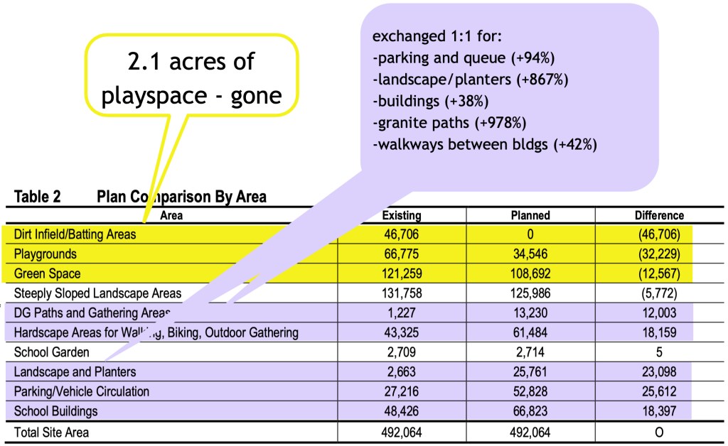 2.1 gone 2.1 acres of play space – gone DMUSD’s own documents admit 2.1 acres of playspace eliminated DMUSD’S Response to Comments filed 5.8.2020 Table 2, page 2-4(we’ve added the colors and callouts) Page 2-5 Response to Comments filed 5.8.2020 by DMUSD click a button below to learn more Field down 54% Blacktop down 54% green space down an acre Share this: Click to share on X (Opens in new window) X Click to share on Facebook (Opens in new window) Facebook Click to email a link to a friend (Opens in new window) Email Like Loading...