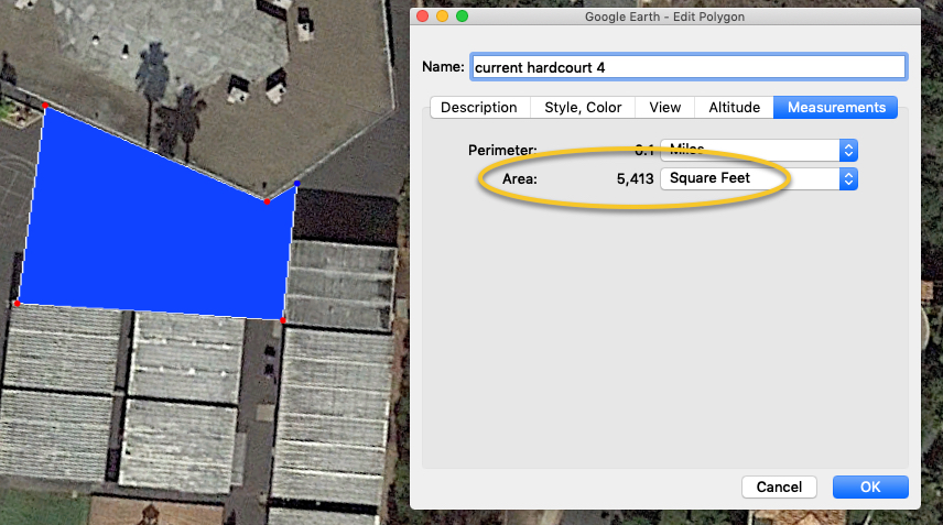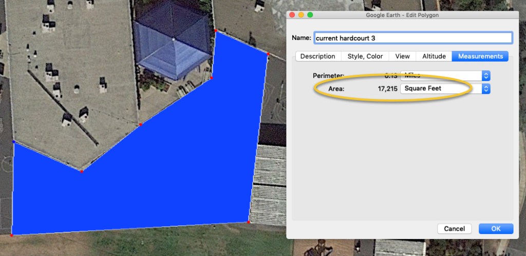 There are five images below. The first image is the full blacktop, which we’ve divided into areas 1-4. The next four images show the square footage of each of the four areas, courtesy of Google Earth.