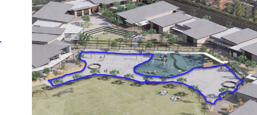Let’s start by identifying the blacktop in the new school design. Here we show the district’s infamous “rendering” of the new school. Although the rendering has been landscaped in a way which exaggerates the field size by about a third, on the positive side it does allow you to see what is blacktop and what is not. We’ve encircled the blacktop play area in blue.