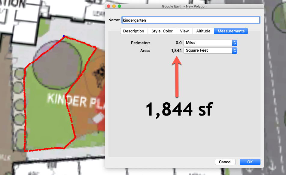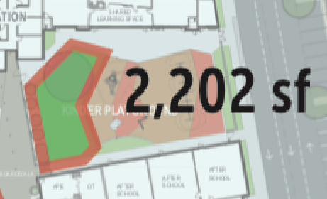 Google Earth says 9,360 sf when you go through the tedium of adding up all the pieces, as we did. The district includes the entire area, even though half of it is clearly play structures and concrete.