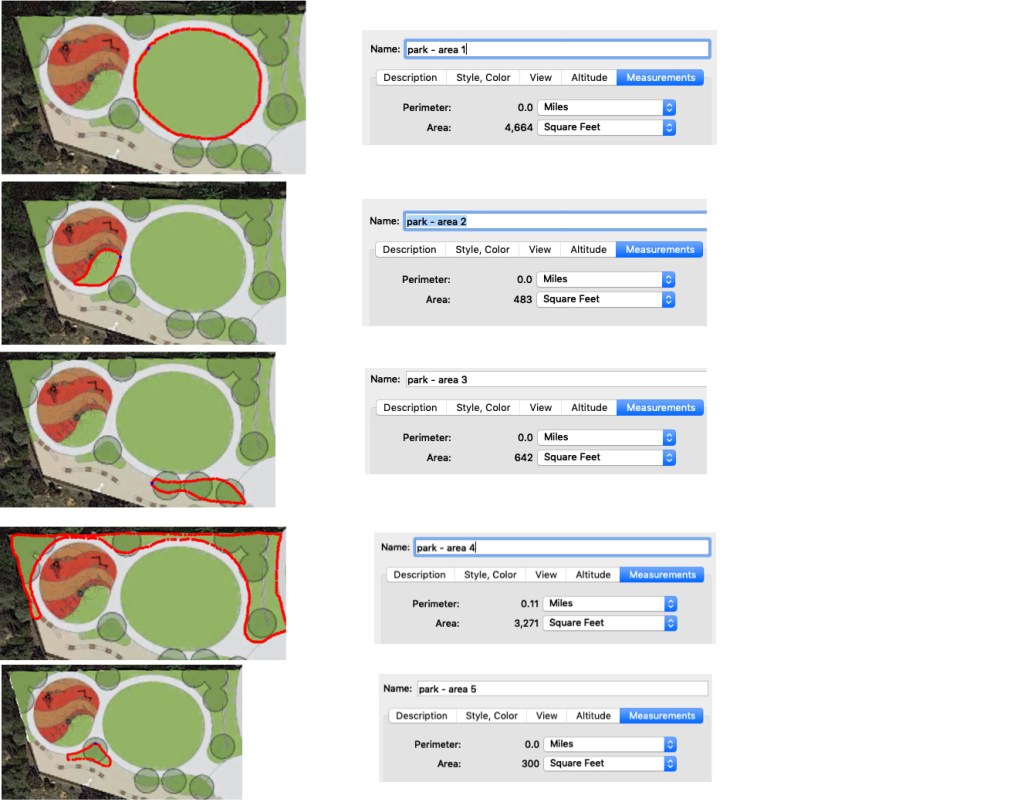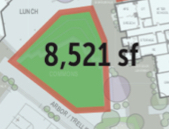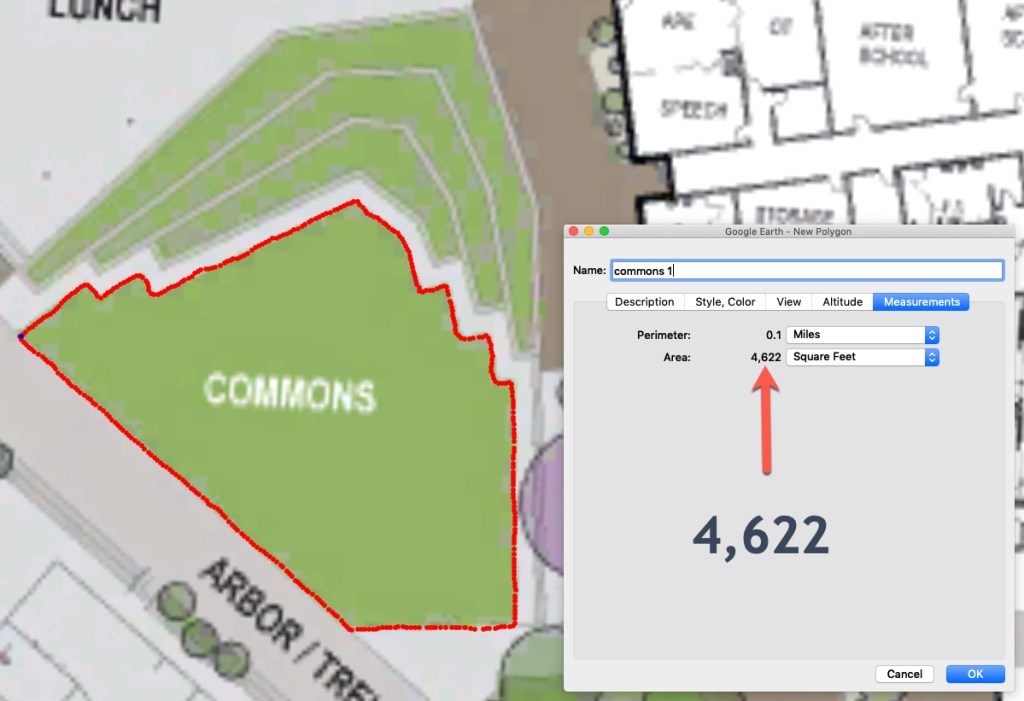 Google Earth says 7,071 sf – not 8,521. We added the base area labeled “commons” (4,622) plus everything in the steps area above it (2,449), generously including even the concrete steps (which we believe will turn out to be mostly concrete). We did not include the hardscape sidewalk in between those two areas, which the district improperly did.