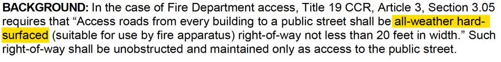 In fact, DSA told us (and we confirmed with fire experts and by reading the rules) that the road must be load-bearing, capable of holding 75,000 pounds of fire apparatus.