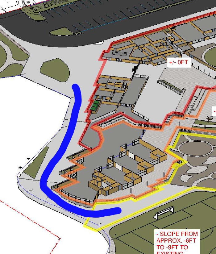 But zoom in with your device and look a little closer. If you look carefully, you’ll see that area is actually a 20′ wide fire access road that runs from the “Entry Plaza” label at Boquita Drive, down the west edge of the site onto the blacktop where there’s a Y shaped turnaround traced on the blacktop. This is dictated by California Division of the State Architect (DSA) fire safety regulations, we have learned.