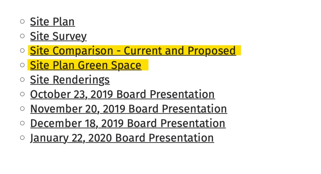 They’ve even dropped field square footage from their presentations – you can’t find it in any recent board presentation or on the district’s prominent website slides. Their use of field square footage diminished after we exposed their false numbers, and disappeared altogether once we started to chase them behind the scenes to justify those numbers in public records requests that drilled an empty well. Instead, all the focus turned to green space. It is as if by changing the focus to green space, they expect us to forget that the field is being shrunk from 160,000 square feet to 78,000 square feet in their design. Or perhaps they wanted to use green space because they could then exclude the dirt infields etc. of the current Heights’ baseball diamonds (40,000 sf) from their numbers, making the reduction in fields seem less severe.
