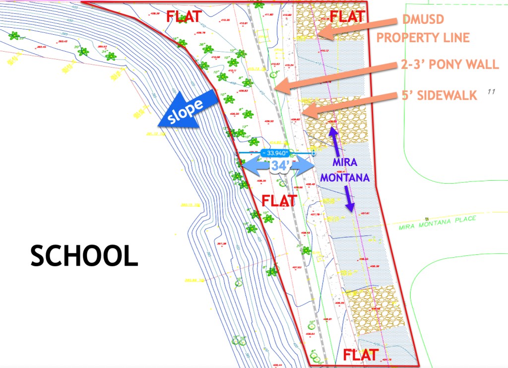 DMUSD’s own survey shows there’s room to do it. The white sandwich between the vertical blue areas is flat space between Mira Montana and where the downward slope starts toward the school site. You can see it is flat for 34’ feet near the center. We’ve verified it’s flat for more than 23’ across the full range of the north parking area (23’ is what you need for a parking space plus a sidewalk) and more than 15’ for the full range of the south pick-up and drop-off area (15’ is which is what you need for a pick-up and drop-off lane plus a sidewalk).