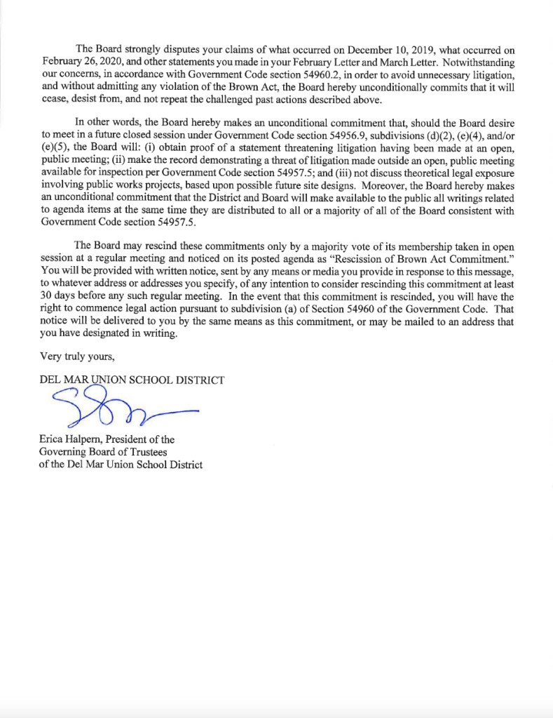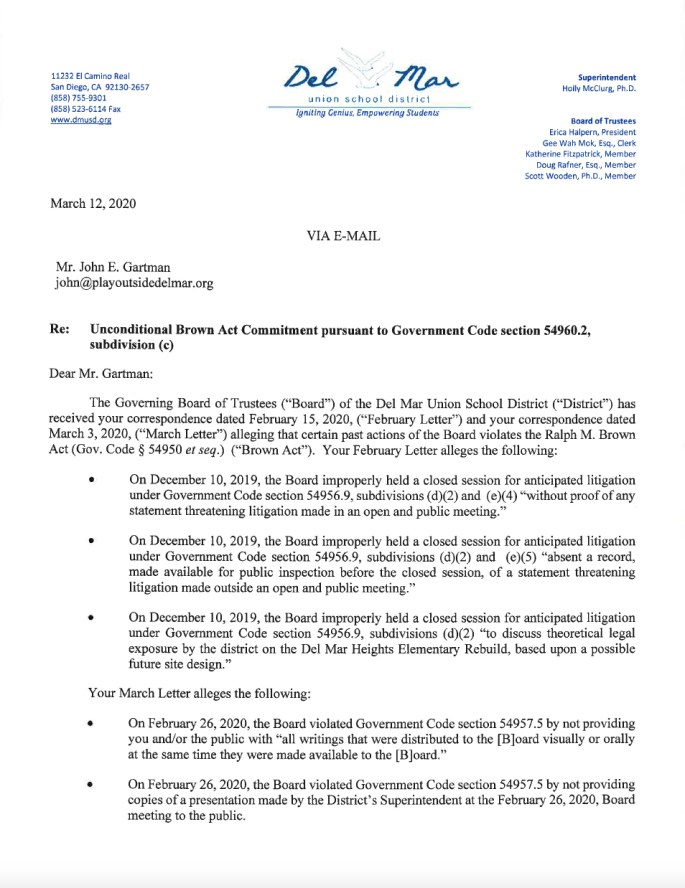 Documents – Open Government Unconditional Brown Act Commitment Letter – GartmanDownload 2.15.2020 Gartman letter Brown Act closed meeting violation Download 3-3-2020 Gartman letter on Brown Act document violationDownload DMUSD response to public records requestDownload DMUSD notice of Dec 10 Special MeetingDownload The Ralph M. Brown Act Share this: Click to share on X (Opens in new window) X Click to share on Facebook (Opens in new window) Facebook Click to email a link to a friend (Opens in new window) Email Like Loading...