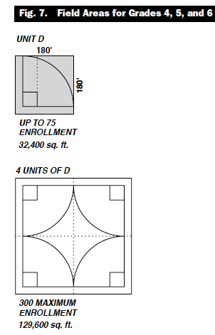 A school with 151-300 students in Grades 4-6 (like the Heights) requires an initial base of 129,600 square feet of field space. You can see the heading FIELD AREAS FOR GRADES 4, 5, AND 6 and the number 129,600 in the diagram on the bottom right, for 300 students maximum enrollment.