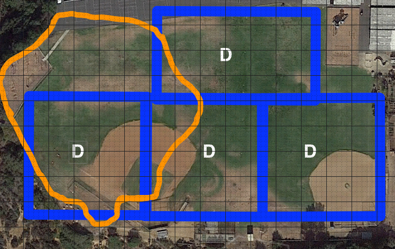 Let’s now take a look at the existing Del Mar Heights field with the guidelines in mind. It shows a really good match. The four so-called “D” field units of 180′ x 180′ (from the Department of Education requirements immediately above) map almost exactly onto the current Heights’ field. Note that we stretched the top block a tad (into a rectangle) to accommodate the irregular shape of the Heights current field. We also built the 10% space buffer into the fat blue border of the fields. In other words, the fields are the green inside the blue borders and the blue borders are the buffer space between fields contemplated by the Department of Education.