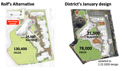 On Nov. 28, in front page news at the Times, the district architect said “field space increased by nine percent,” which the board president described as a “pretty impressive response to the community’s request” for change. In the article, the district said the field is now 76,020 – less than ever previously reported by the district, and certainly no increase – and the green space dropped a whopping 32,596 square feet to 110,393.
