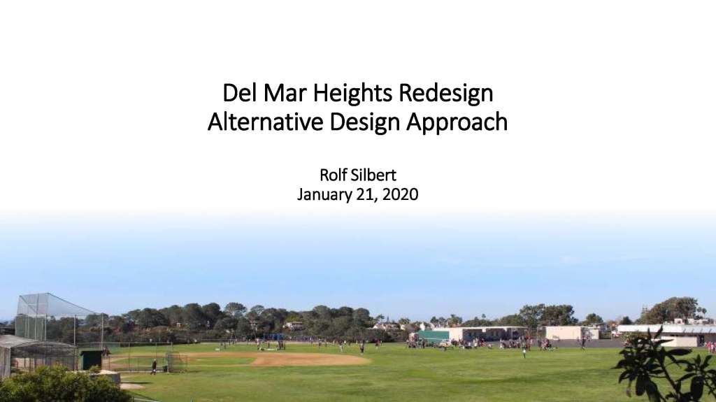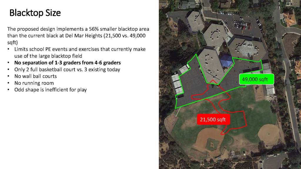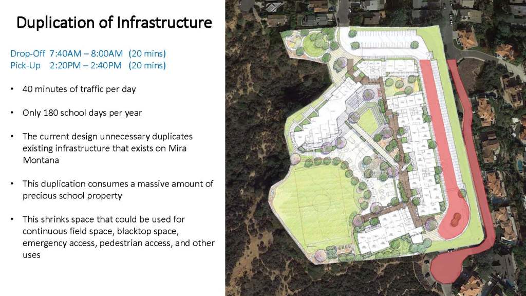 One reason we think this design deserves consideration by all of us is that it attacks 2 of the 3 key problems we had previously identified in the current school design. It both removes the gratuitous “community park” and uses existing infrastructure on Mira Montana to share the load of parking, drop-off, and pick-up during the few minutes each day where those occur. You can see in our image below of the January 2020 DMUSD site design that Rolf attacked the 17,000 square foot problem and the 44,000 square foot problem, both of which we believe are extremely poor trades for less field space.