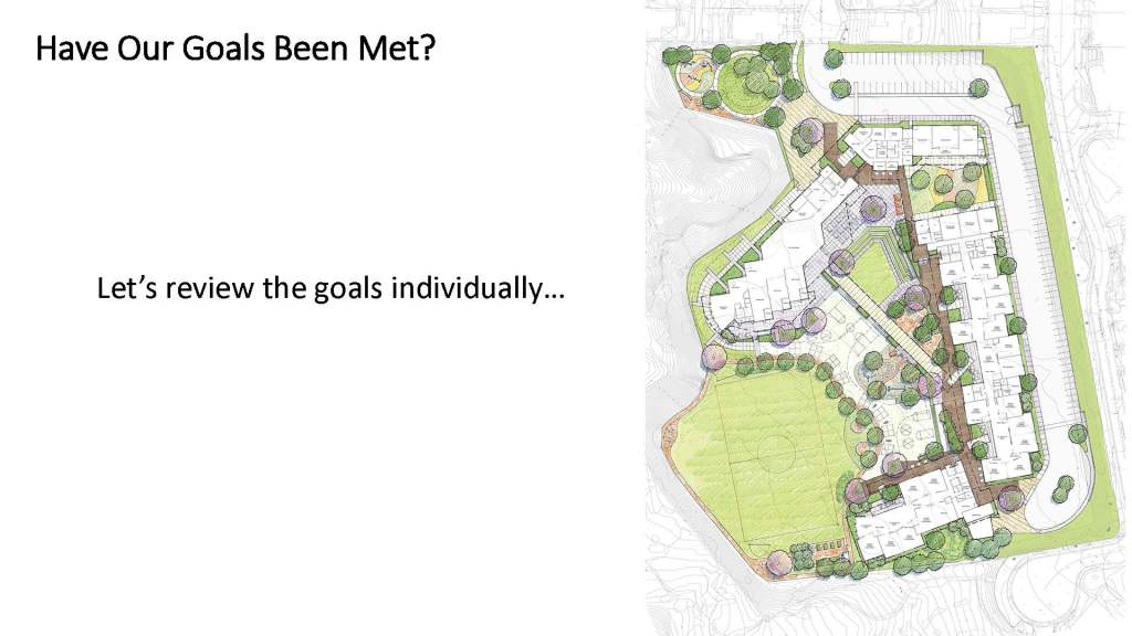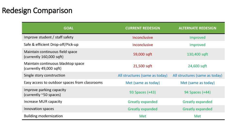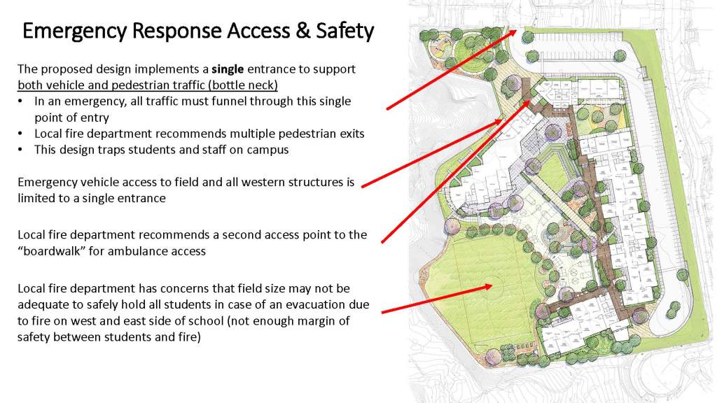 To orient you, the presentation starts by identifying the district’s redesign goals, then shows how the district’s new school design falls short on safety, drop-off and pick-up, and playfield space. He then shows how his alternative design is a substantial improvement in each of these areas – plus environmentally superior by leveraging already existing community infrastructure.