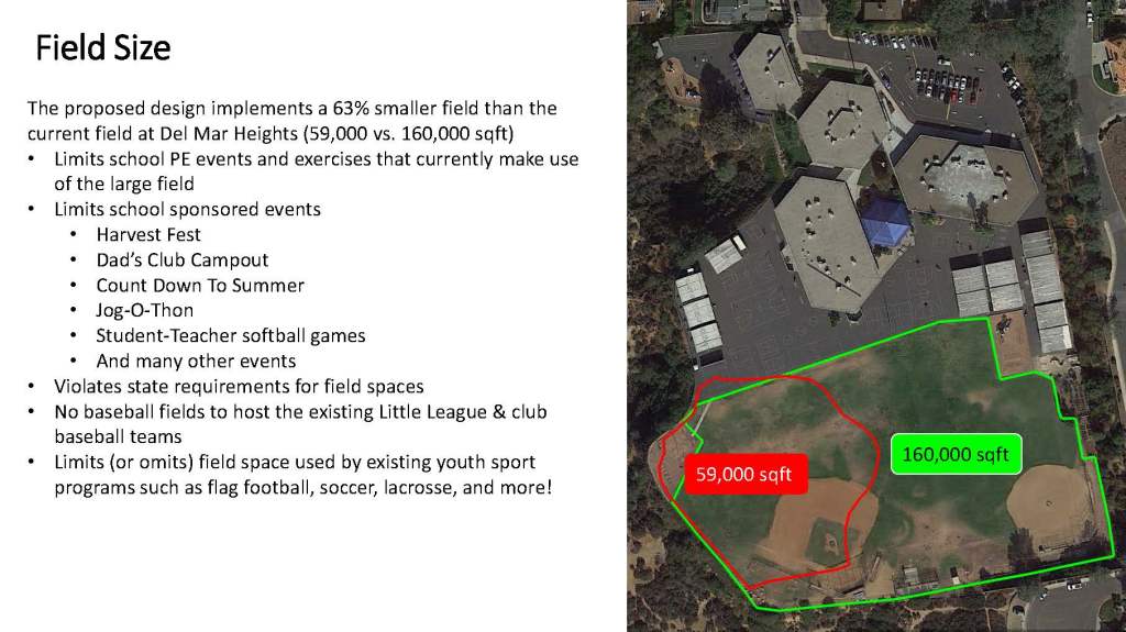 [UPDATE: Rolf’s slides were created before the district’s January design update, and therefore use the district’s old field size number of 59,000 sf.]